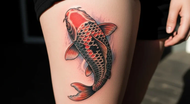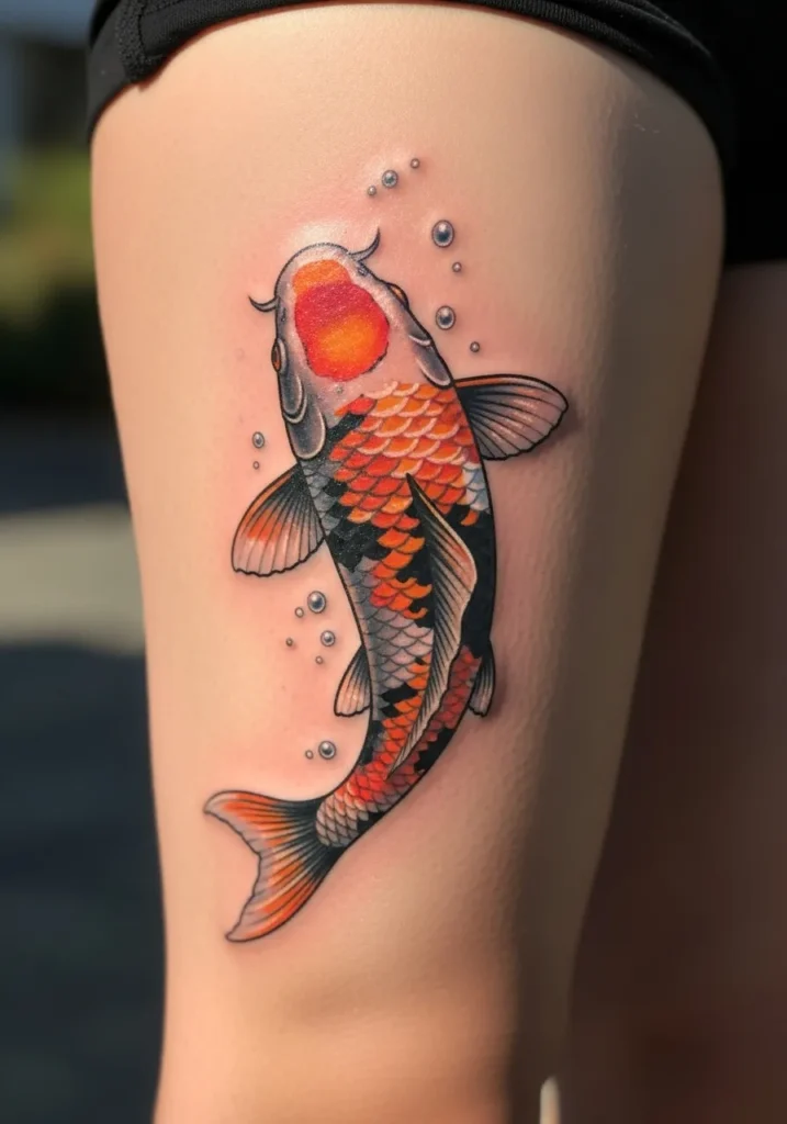 This colorful thigh tattoo brings a vibrant koi fish to life with shades of orange, black, and white, swimming gracefully upward through bubbles. The shimmering scale work and flowing tail make it look like it’s in motion, catching light beautifully on the skin.