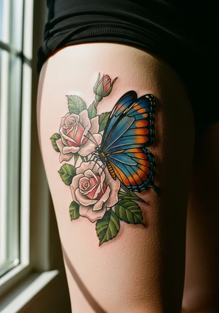 This vibrant tattoo showcases a large blue and orange butterfly resting among soft pink roses, all rendered in fine detail on the upper thigh. The colors are rich and luminous, especially under natural light, while the realistic petal textures make it feel like a living artwork. The design’s placement enhances its delicate beauty while still standing out boldly.