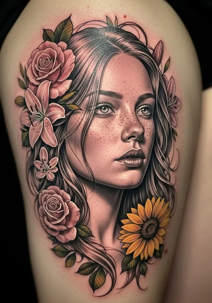 What draws me to this tattoo is its emotional depth. It’s more than just a pretty design—it feels personal, almost like it tells a quiet story about resilience and beauty. There’s something incredibly graceful about how the flowers frame the woman’s face, turning the thigh into a living canvas of confidence.