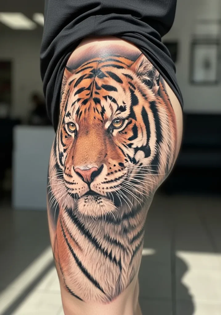 This tiger thigh tattoo looks so vivid it almost feels like the animal could move. The soft orange tones blend seamlessly into the skin, while the precise black striping and gentle fur details make it look three-dimensional. It’s a large, bold design that commands attention without feeling too harsh, and it perfectly fits the thigh’s natural contours.