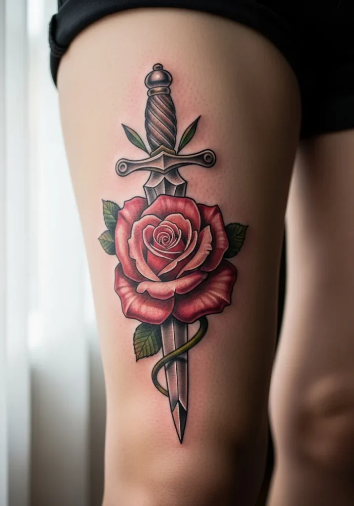 This classic realism tattoo pairs a striking red rose with a silver dagger that runs vertically along the thigh. The crisp shading gives the metal a real sheen, while the rose petals have soft highlights that make them appear velvety to the touch. The delicate vine wrapping the blade adds a subtle touch of movement that ties the whole design together.