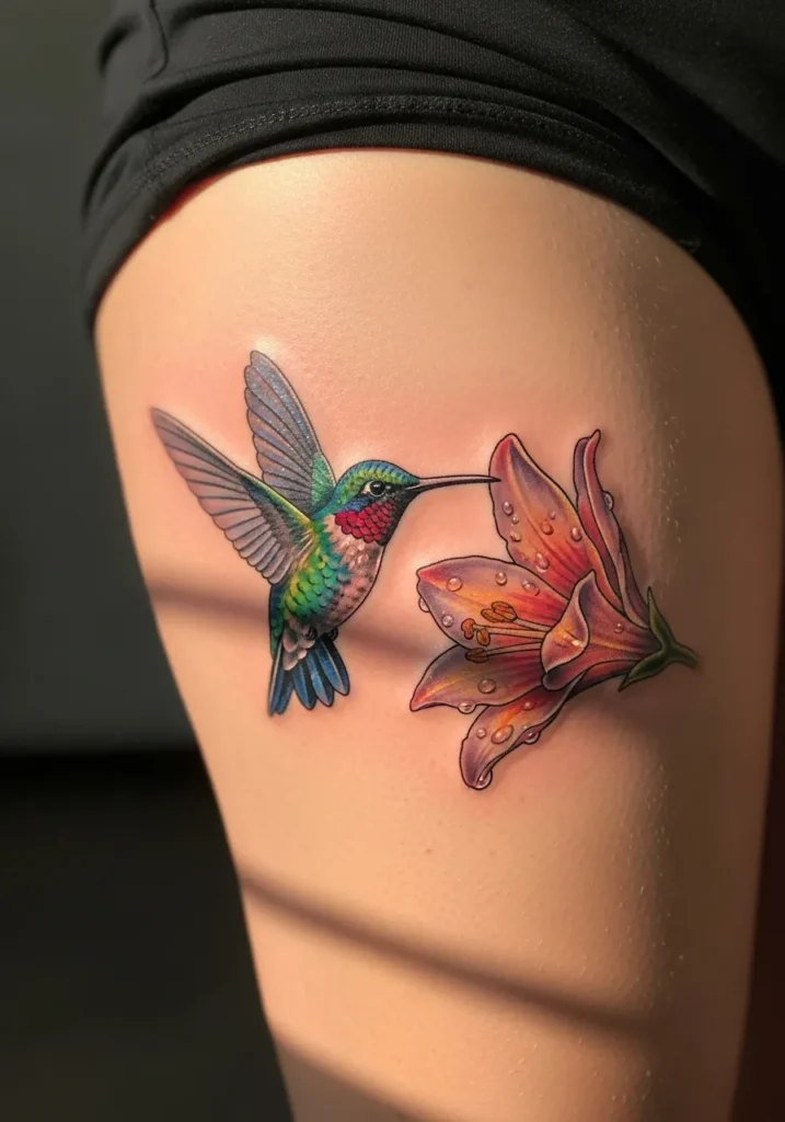This realistic thigh tattoo shows a tiny hummingbird hovering beside a blooming lily, both inked with incredible detail and color depth. The bird’s iridescent feathers shimmer in green and blue hues, while the soft pink petals of the lily glisten with tiny dew drops. The medium size and placement on the upper thigh make it feel airy and elegant, like a fleeting moment frozen in time.