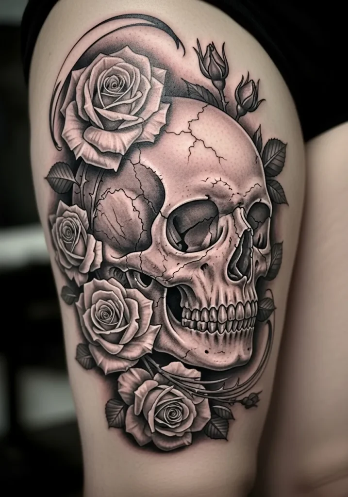 This striking black and grey realism tattoo features a detailed skull surrounded by lush roses, each petal shaded to perfection. The placement on the thigh gives it a bold yet refined presence, and the subtle cracks in the skull add an authentic texture that feels raw and artistic. The contrast between the dark tones and soft floral shapes gives the whole piece a haunting beauty.