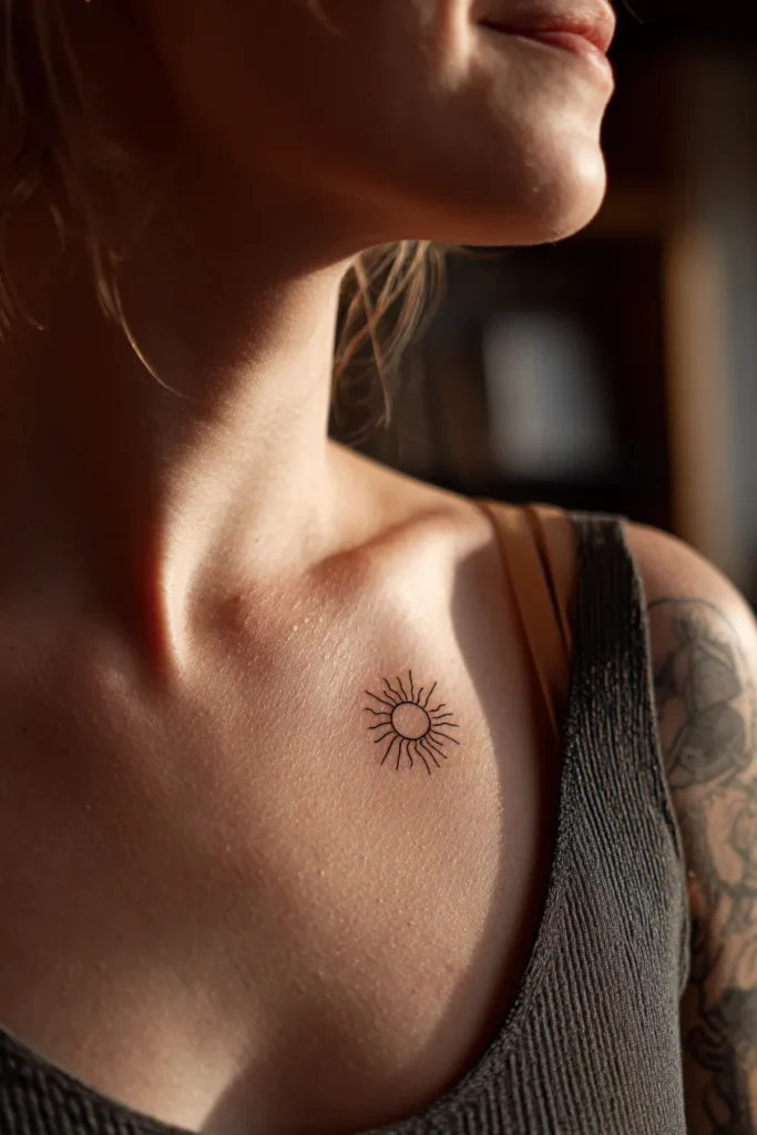 This piece shows a small radiant symbol inked near the shoulder, created with fine lines that extend outward in a gentle sunburst effect. The size is subtle and the black ink keeps it clean, letting the placement add just enough presence without overpowering the area.