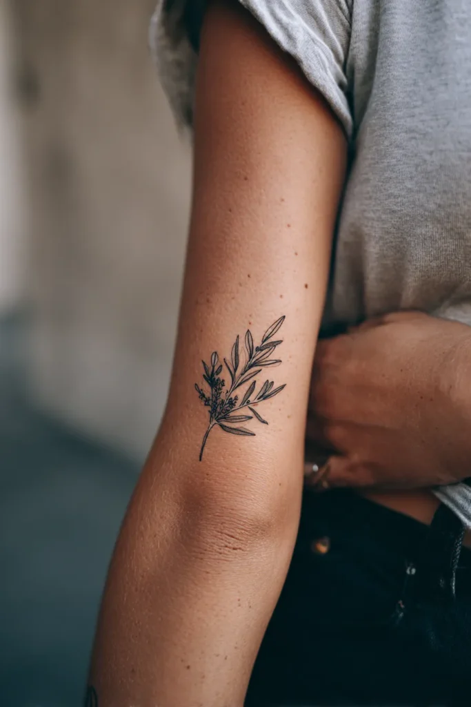 This tattoo features a slim olive branch placed along the inner forearm, drawn with fine black lines and minimal leaf detail. The design follows the natural curve of the arm, which makes it feel balanced and easy on the eye.