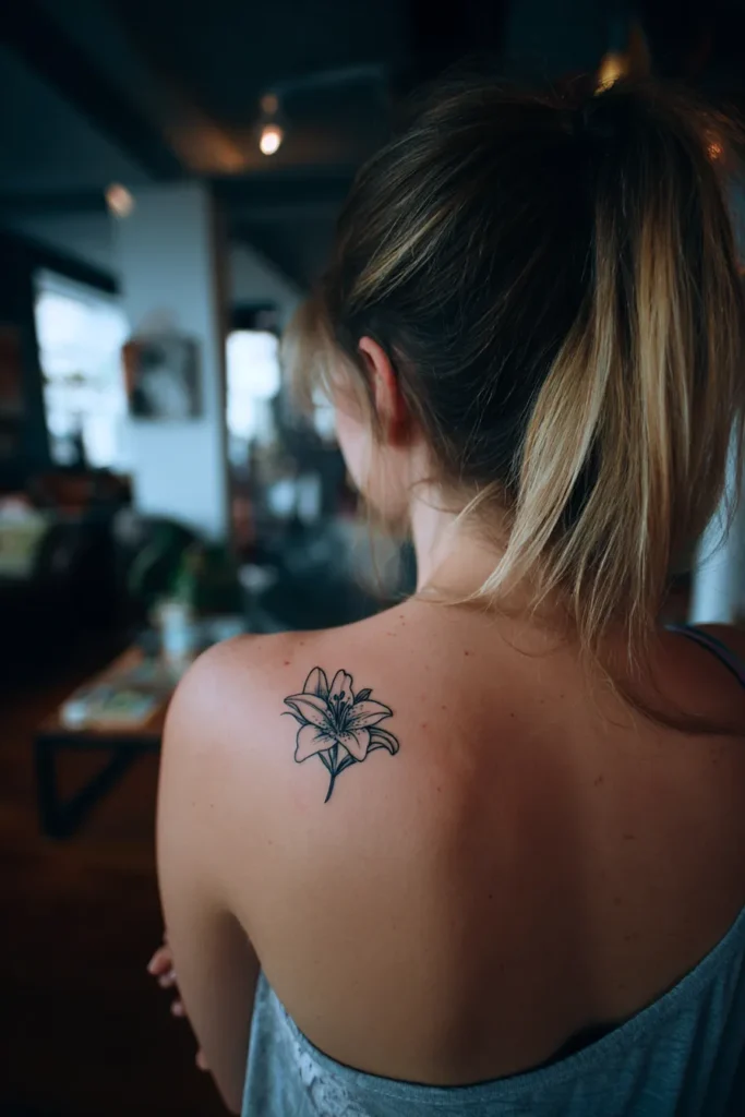 This tattoo features a fine line lily placed softly on the upper back near the shoulder blade, drawn in clean black ink with gentle petal detailing. The size feels just right, not too bold and not too tiny, and the placement allows the design to sit naturally with the curve of the shoulder for an elegant and balanced look.