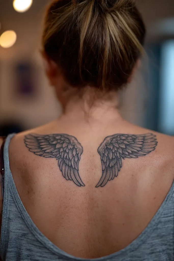 This tattoo features a pair of detailed angel wings spread gently across the upper back, drawn in fine black linework with soft feather detailing. The placement is centered and balanced, allowing the wings to follow the natural shape of the shoulders while keeping the overall look clean and elegant rather than heavy.