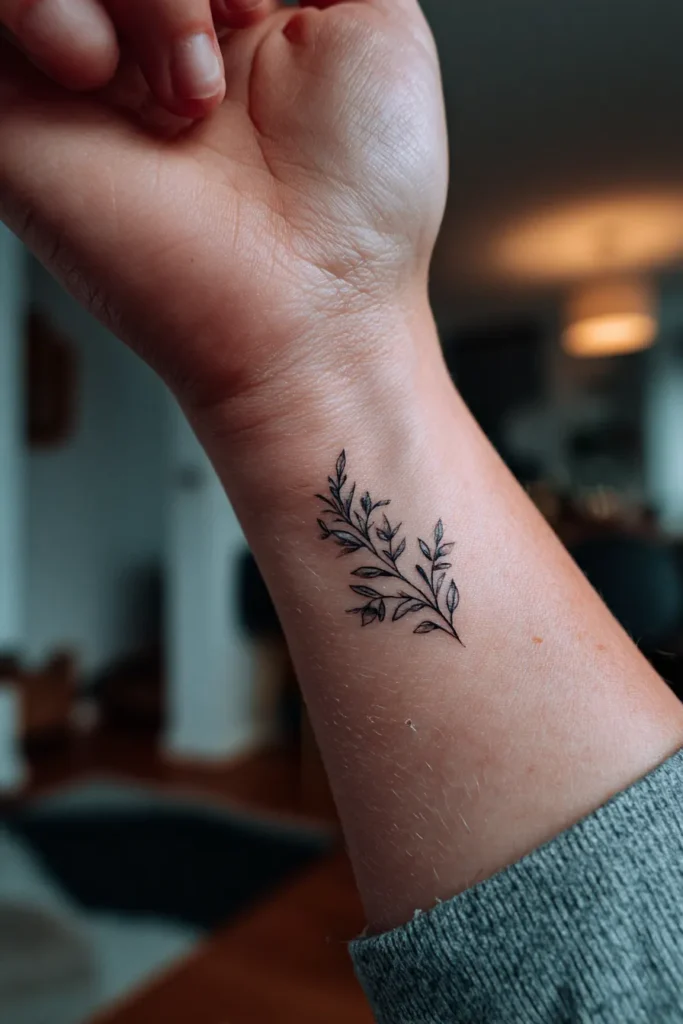 This tattoo shows a small olive branch placed along the inner wrist, created with fine black lines and minimal leaf detailing. The size keeps it subtle and personal, and the placement makes it easy to see throughout the day without feeling showy.
