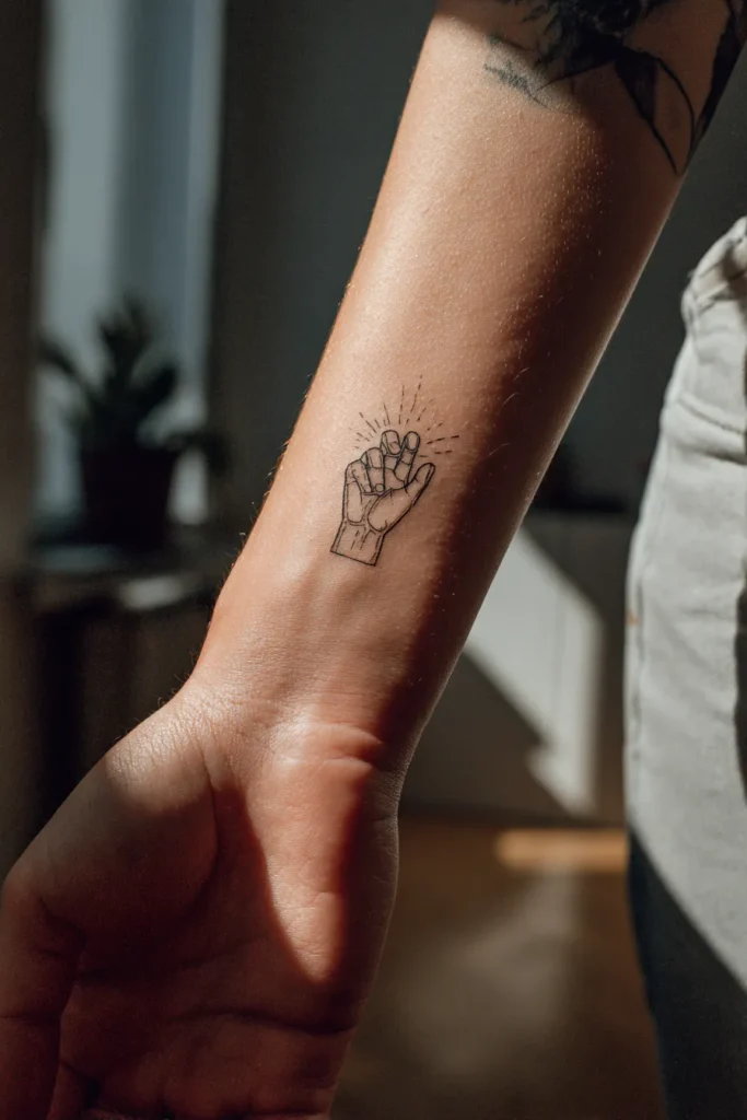 This tattoo features a small open hand placed along the inner forearm, drawn in fine black linework with subtle rays radiating above the fingers. The size is modest and the details are clean, giving it a soft illustrative feel that sits naturally on the skin without overpowering the arm.