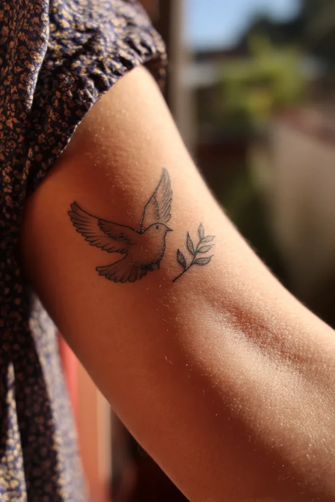 I love how this dove feels calm rather than dramatic. It instantly brings to mind peace and hope without leaning into anything overly bold. It feels like one of those tattoos that quietly carries meaning and still looks beautiful with any outfit or season.