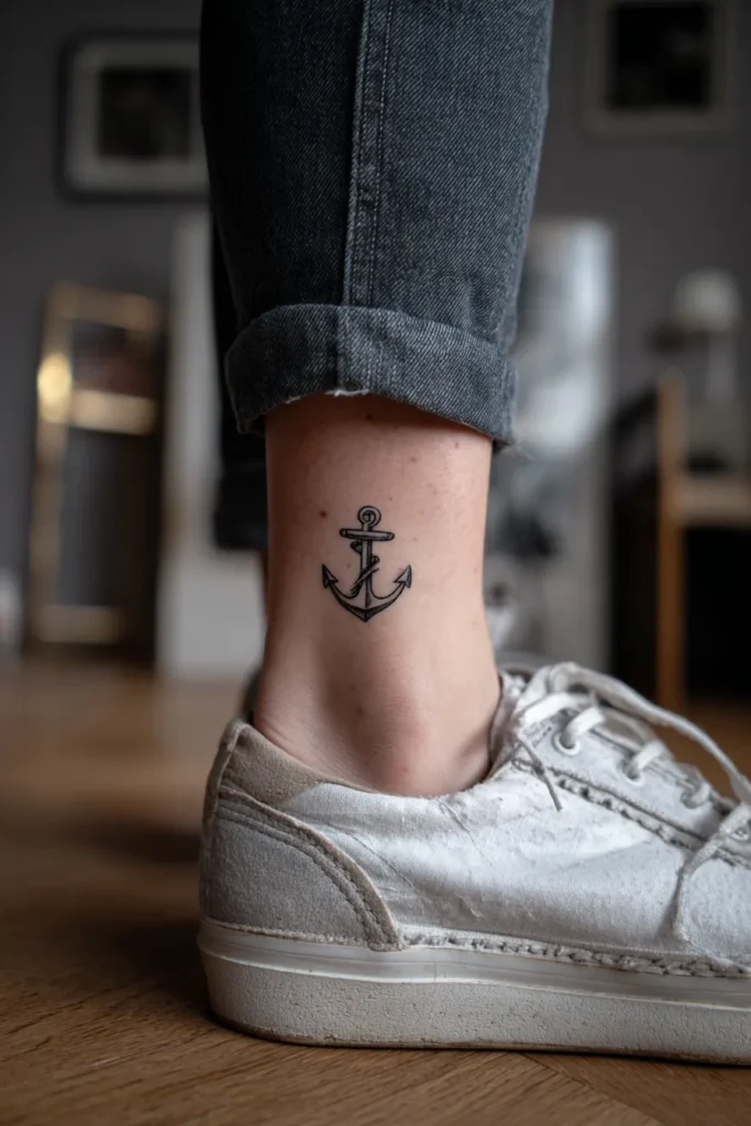 This tattoo shows a petite anchor placed just above the ankle, inked in clean black lines with minimal detail. The size keeps it discreet while the placement gives it a grounded and intentional feel that works beautifully with sneakers or bare feet.
