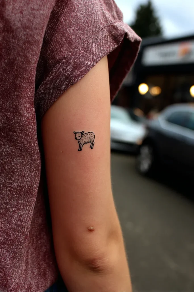 This tattoo features a tiny lamb illustrated in clean fine line black ink, placed softly on the upper arm just above the elbow. The design is simple and almost storybook like, with delicate dot texture and minimal detailing that keeps it light and approachable rather than overly polished.