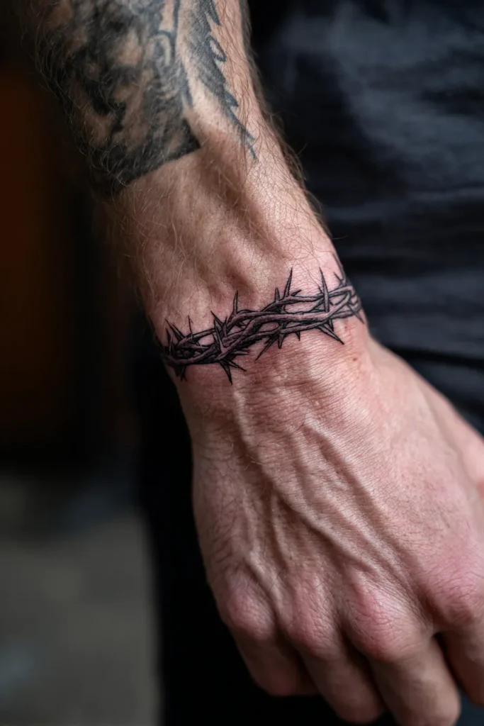 This tattoo wraps a fine line crown of thorns around the wrist, using dark black ink with sharp yet delicate detailing that gives it a raw and symbolic look. The placement mimics a bracelet, sitting snugly against the skin, and the minimal shading keeps the design clean despite the powerful imagery.