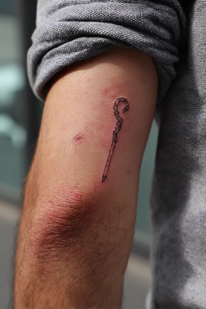 This tattoo features a slim shepherd’s staff placed along the inner arm near the elbow, drawn in fine black linework with subtle wrapped detail near the top. The design is narrow and understated, and the placement keeps it feeling personal while allowing the symbol to sit naturally with the shape of the arm.