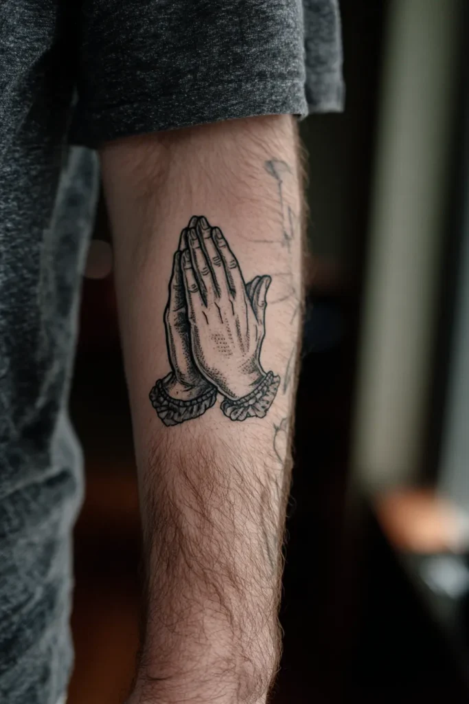 This tattoo shows a pair of praying hands inked on the forearm using clean black linework and gentle shading to define the fingers. The style leans classic but remains refined, and the medium size gives it presence without overwhelming the arm.