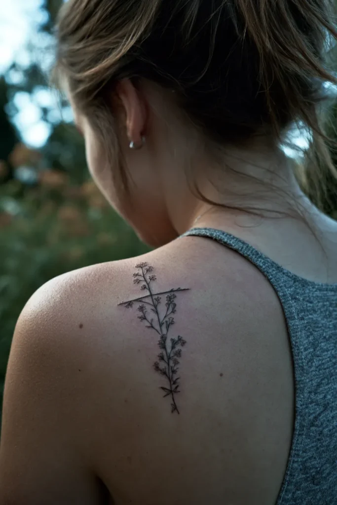 This tattoo features a slender cross intertwined with a delicate botanical sprig, placed vertically along the upper back near the shoulder blade. The fine black linework keeps the design light and refined, while the placement allows it to feel personal and softly revealed depending on clothing.