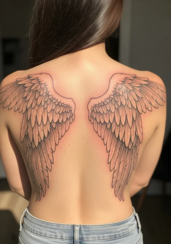 This tattoo features large angel wings stretching across the upper back, done in fine line style with soft beige, blush, and muted brown tones. The feathers are detailed and layered, following the natural shoulder line and tapering gently toward the spine. The size gives it presence while still feeling graceful and balanced.