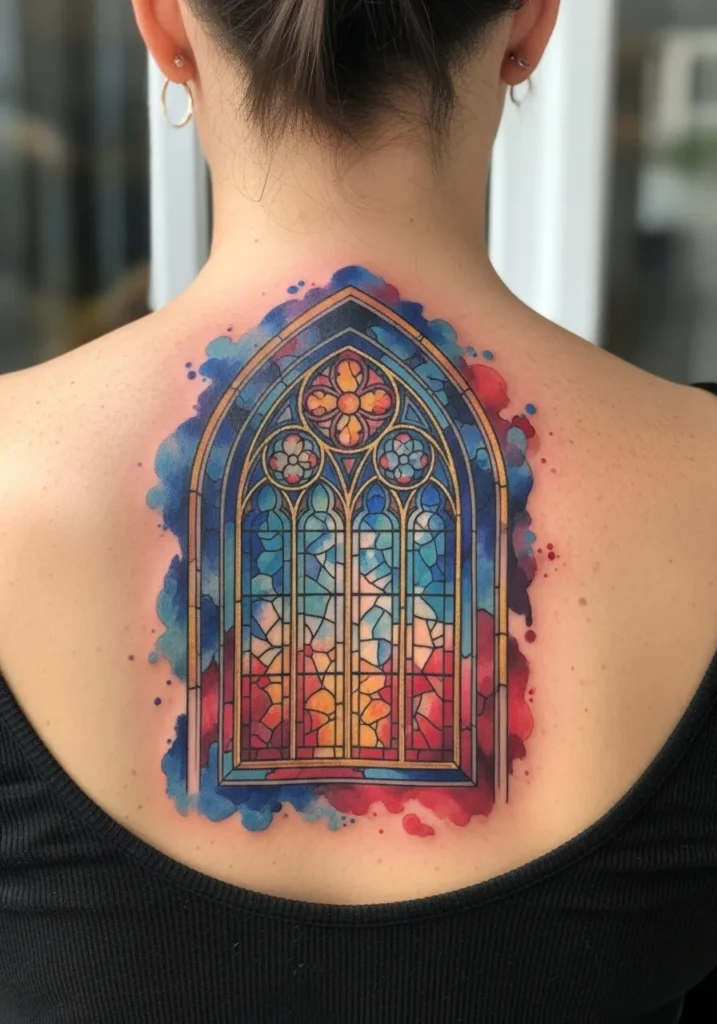 This tattoo shows a large stained glass window design centered on the upper back, created in watercolor style with rich blues, reds, and warm gold accents. The shape follows a classic church window silhouette, with painterly edges and soft blending. The size makes it a striking focal point.