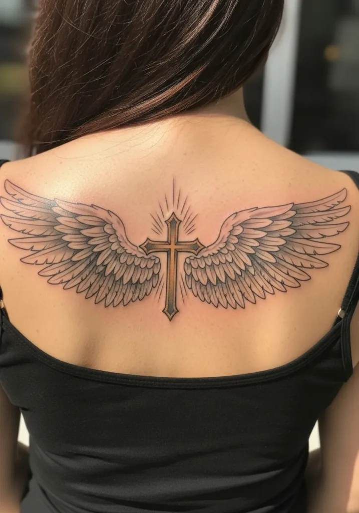 This tattoo features a cross with angel wings stretching across the shoulder blades, done in fine line style with soft gray and beige tones. The wings are symmetrical and detailed, while the cross anchors the design at the center. The size feels strong yet elegant.