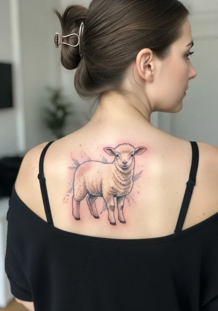 This tattoo features a lamb placed on the upper back, done in soft watercolor tones with gentle shading in warm neutrals. The style feels illustrative yet delicate, with the lamb positioned slightly off center. The size keeps it visible but not overwhelming.