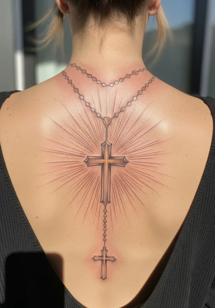 This tattoo shows a cross centered on the upper back with radiating lines extending outward, paired with a rosary style necklace detail. The fine line work uses soft gold and warm brown tones, giving it a glowing effect. The placement makes it feel intentional and symbolic.