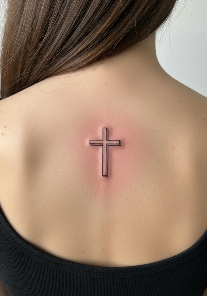 This tattoo features a small cross placed neatly between the shoulder blades, done in fine line style with muted brown tones. The edges are clean, with subtle shading that gives it depth without heaviness. The size keeps it classic and calm.