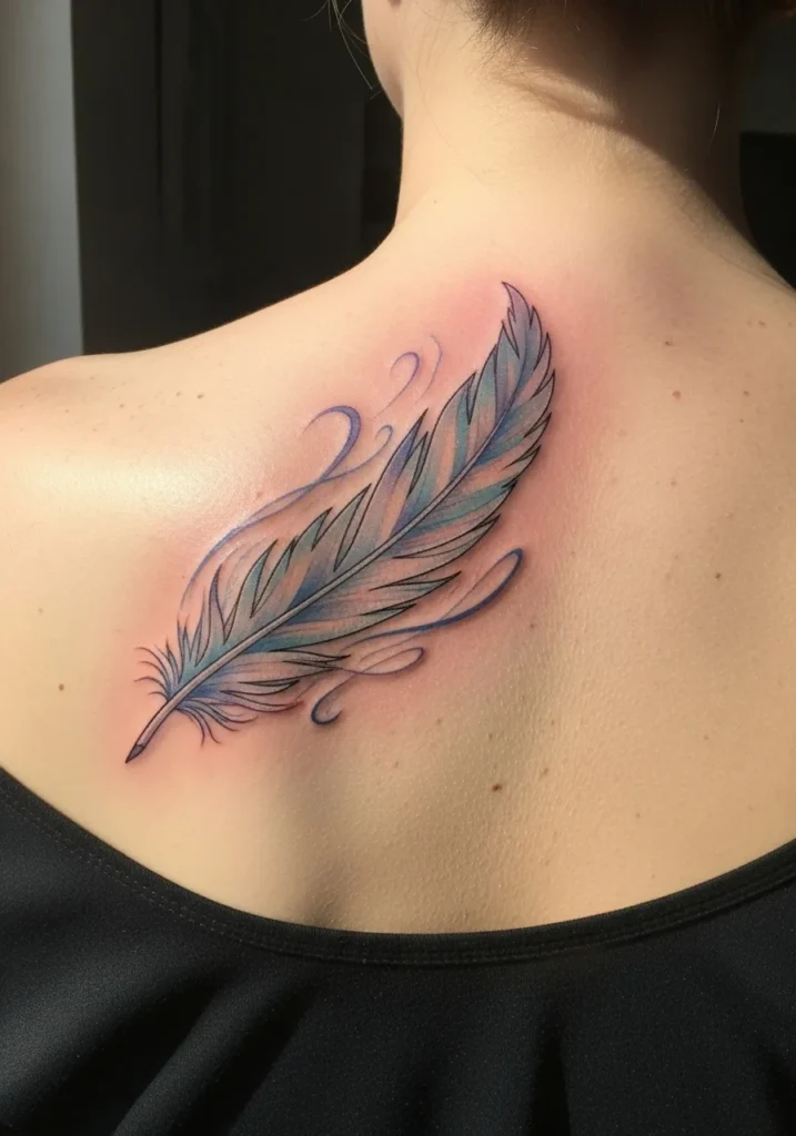 This tattoo shows a feather placed diagonally on the upper back, done in soft watercolor tones with gentle blues and muted neutrals. The feather has flowing lines and subtle shading that give it movement and lightness. The size feels elegant and intentional.