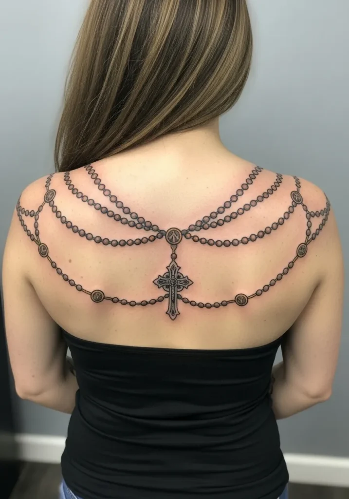 This tattoo features a rosary design draped across the upper back like layered necklaces, done in fine line style with muted brown and soft rose tones. The beads follow the shoulder line beautifully, with a cross hanging centered below. The size gives it presence while still feeling elegant and balanced.