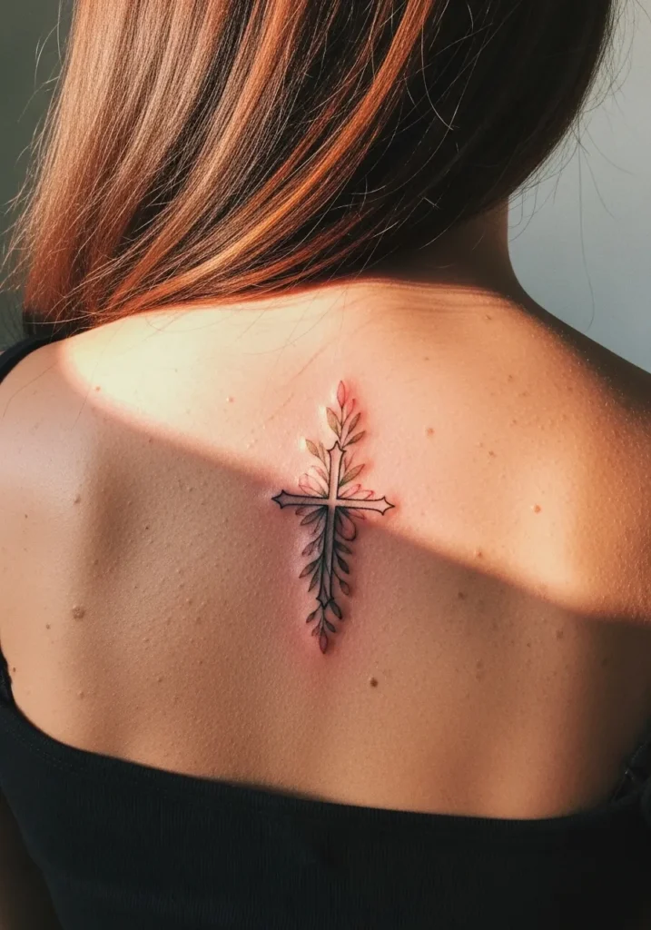 This tattoo features a cross accented with delicate floral elements placed on the upper back, created in fine line style with soft pinks and muted greens. The flowers soften the structure of the cross, giving it warmth and balance. The size feels calm and refined.