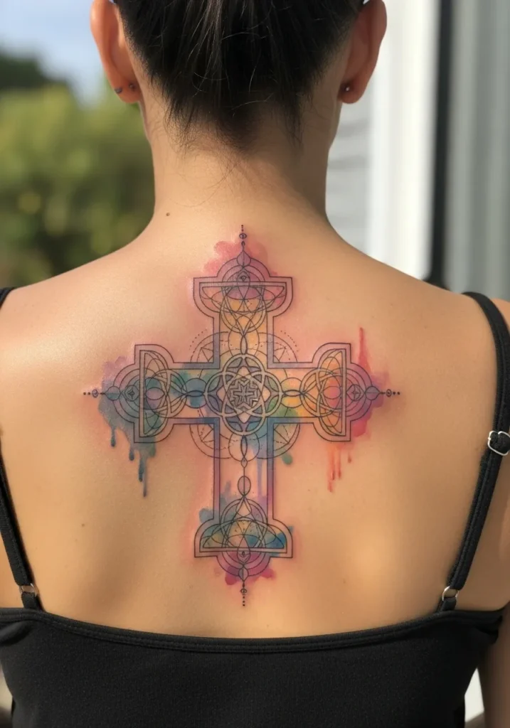This tattoo features an ornate cross centered on the upper back, done in watercolor style with layered blues, reds, and warm gold accents. The painterly texture gives it depth while keeping the shape classic. The size makes it a strong focal point.
