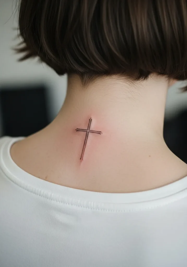 This tattoo shows a small fine line cross placed neatly at the nape of the neck, created in soft brown tones with minimal shading. The size is subtle, and the placement feels intentional and calm. It sits quietly just below the hairline.