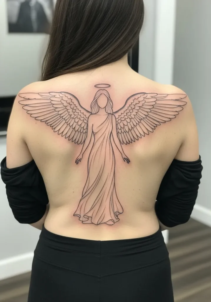 This tattoo shows a full angel figure spanning the upper back, done in fine line style with soft beige, blush, and muted brown tones. The wings stretch outward symmetrically, framing the shoulders. The size feels protective and purposeful.