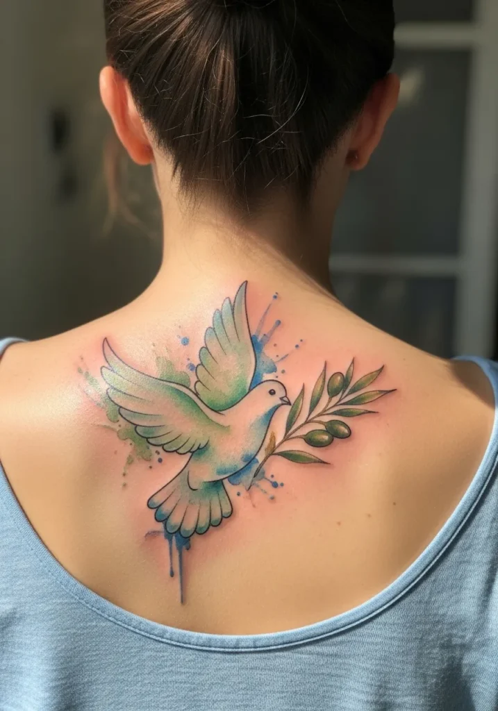 This tattoo shows a dove holding an olive branch, placed on the upper back and done in watercolor style with soft blues, greens, and warm neutrals. The wings are slightly open, giving the design a sense of movement and peace. The size feels uplifting.