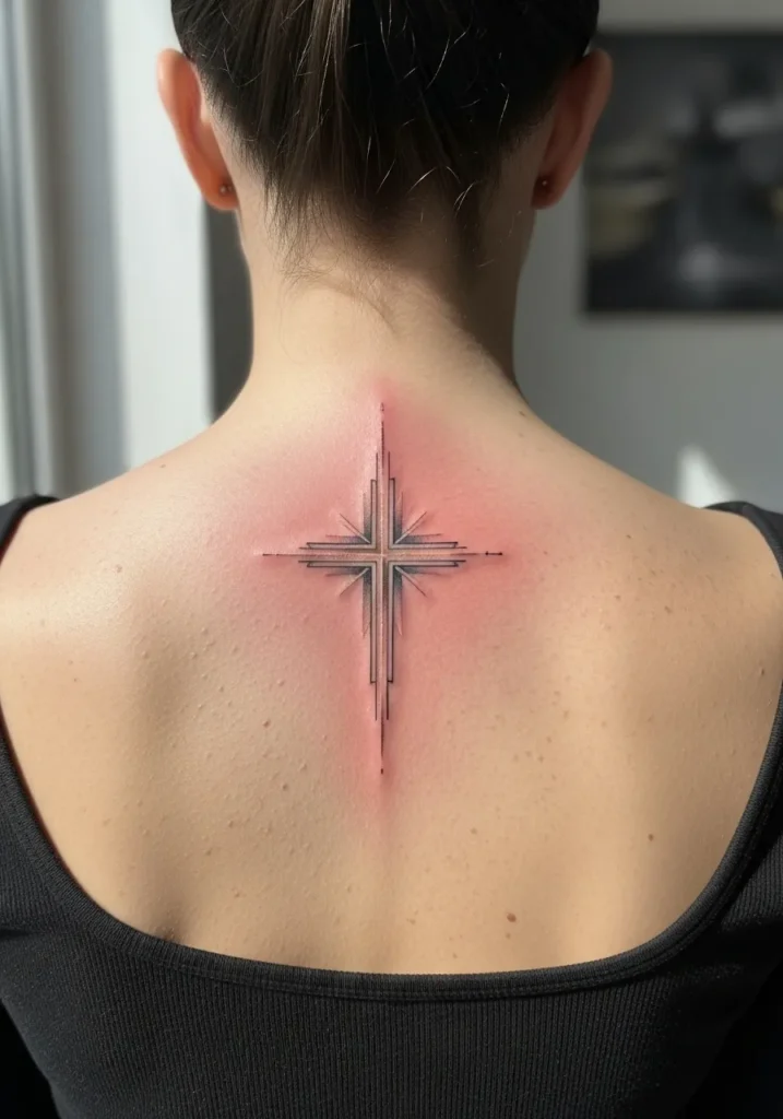 This tattoo features a vertical cross centered on the upper back, done in fine line style with soft gold and muted rose tones. Gentle radiating lines extend outward, creating a subtle glowing effect. The placement makes it feel grounded and intentional.