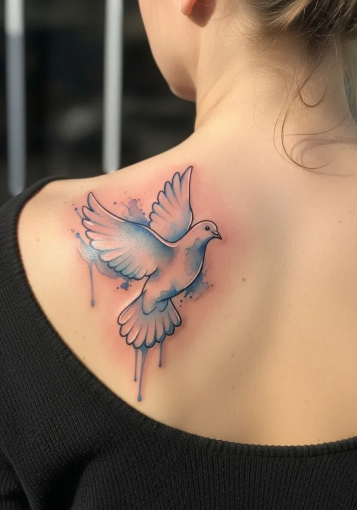 This tattoo features a dove in mid flight placed on the upper back near the shoulder, done in soft blue, white, and blush tones. The wings are open and expressive, with gentle shading that gives the bird movement and life. The size feels uplifting without overwhelming the space.