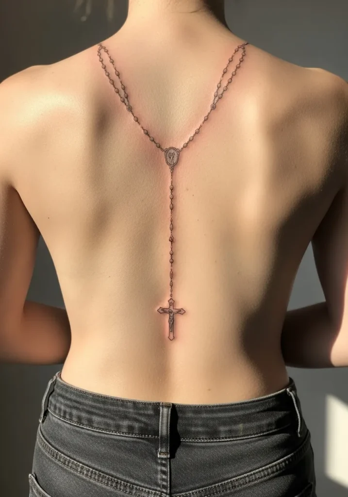 This tattoo shows a rosary running vertically down the spine, designed in fine line style with muted brown and soft rose tones. The beads are evenly spaced, and the cross rests lower on the back, following the natural line of the body. The length gives it elegance and purpose.