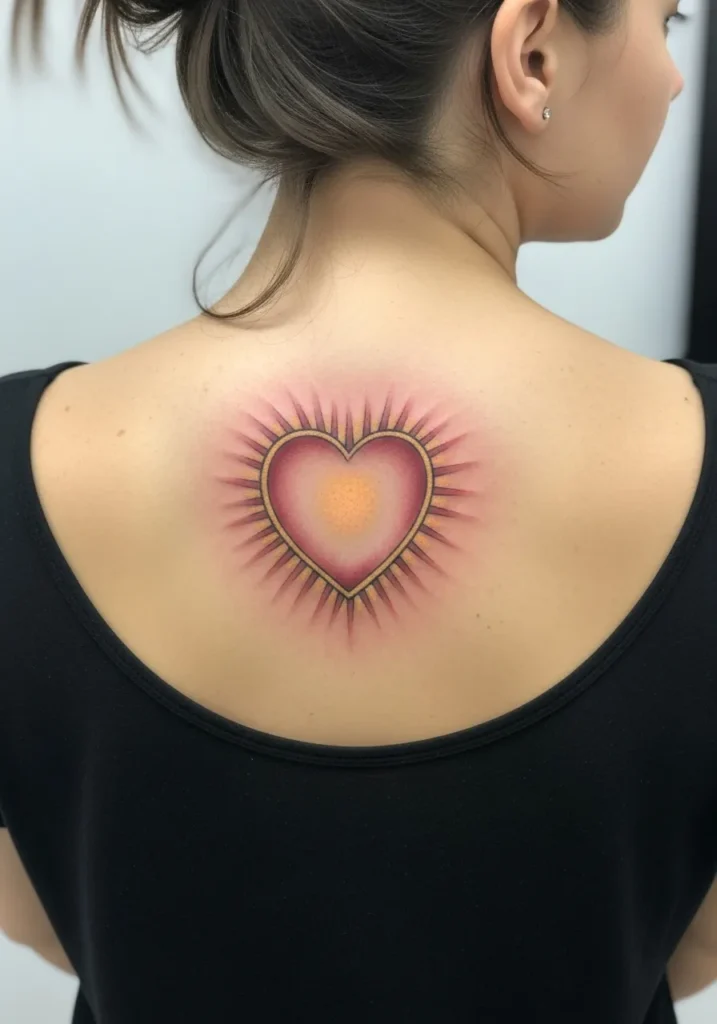 This tattoo features a sacred heart placed at the center of the upper back, done in soft red, blush, and warm gold tones. Radiating lines surround the heart, giving it a gentle glow effect. The size is medium and perfectly balanced.