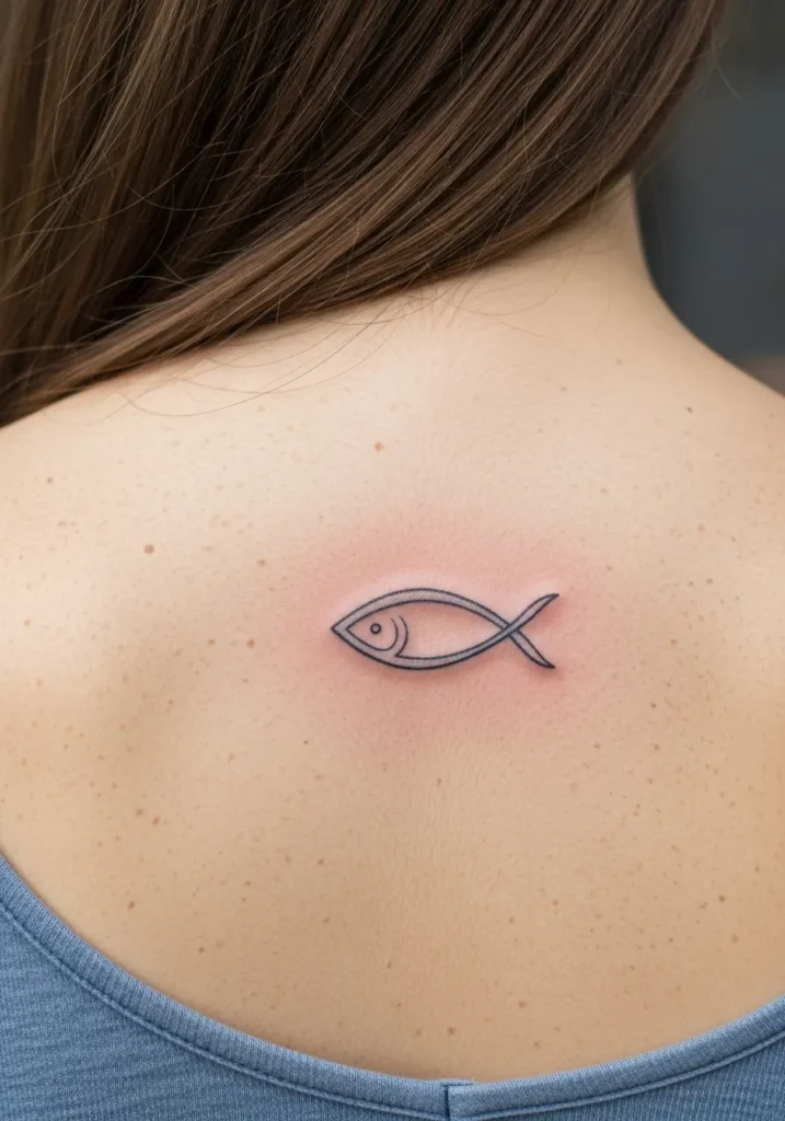 This tattoo shows a small ichthys fish symbol centered on the upper back, created in fine line style with muted blue gray tones. The design is minimal, clean, and understated, allowing the symbol itself to stand out. The size keeps it subtle and thoughtful.