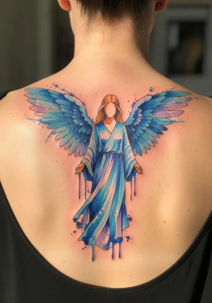 This tattoo features a full angel figure centered on the upper back, done in watercolor style with soft blues, golds, and gentle blush tones. The wings extend outward, while the flowing robe adds movement and softness. The size makes it a true focal point.