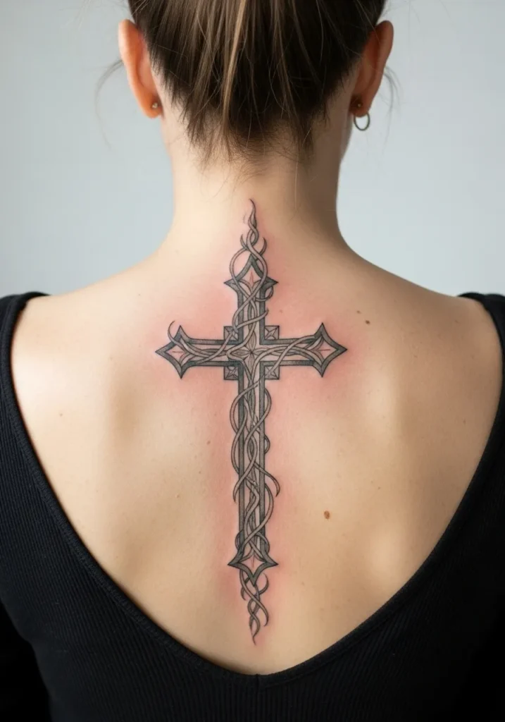 This tattoo shows a detailed cross placed vertically at the center of the upper back, done in fine line style with soft brown and muted gold accents. Subtle decorative elements give it a classic and traditional look. The size feels strong and intentional.