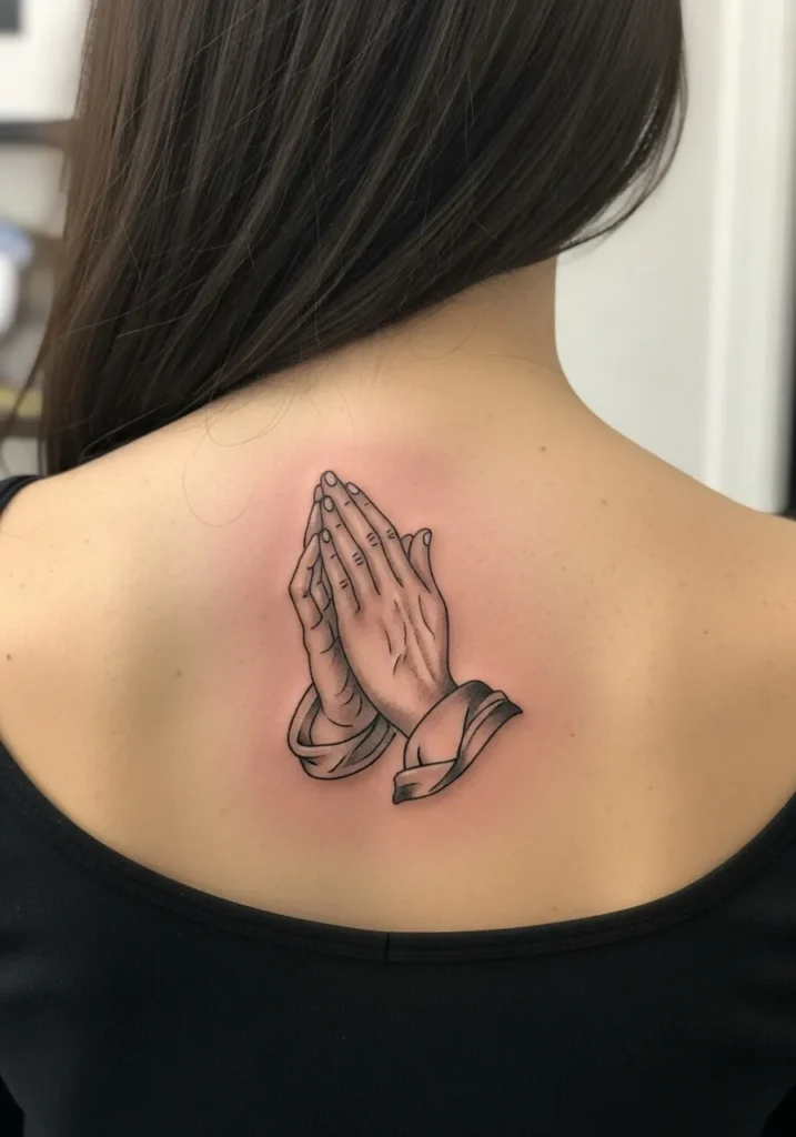 This tattoo features praying hands placed at the center of the upper back, done in fine line style with soft beige and muted brown tones. The hands are gently shaded to add depth, while the overall size keeps it calm and balanced. The placement makes it feel intentional and quietly powerful.