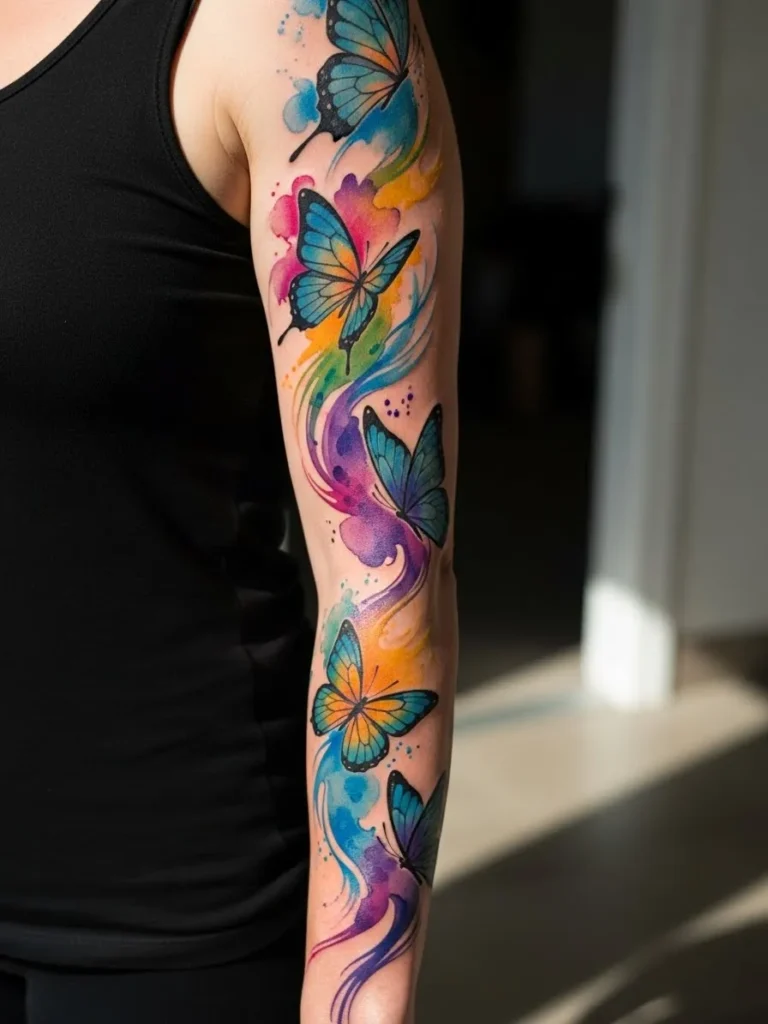 This watercolor sleeve features multiple butterflies placed along the arm, connected by flowing trails of purple, blue, yellow, and teal. The butterflies are softly outlined, while the watercolor swirls add motion and depth from shoulder to forearm. It is a full sleeve that feels light, feminine, and dynamic.