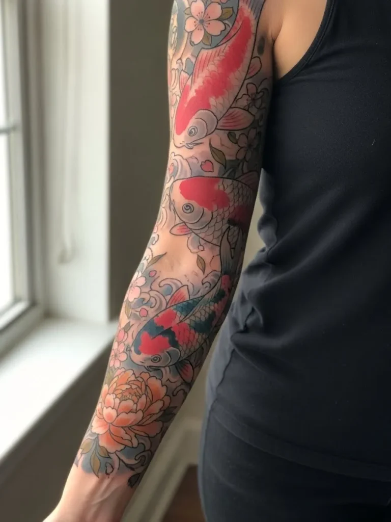 This sleeve combines traditional koi fish imagery with a watercolor twist, flowing from upper arm to wrist. Soft reds, muted blues, and gentle grays blend with floral accents and delicate outlines. The watercolor shading keeps the design fluid while still honoring classic koi symbolism.