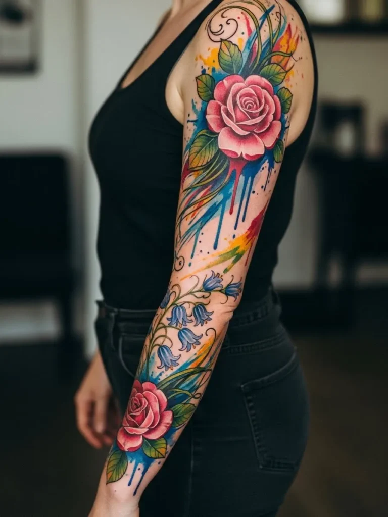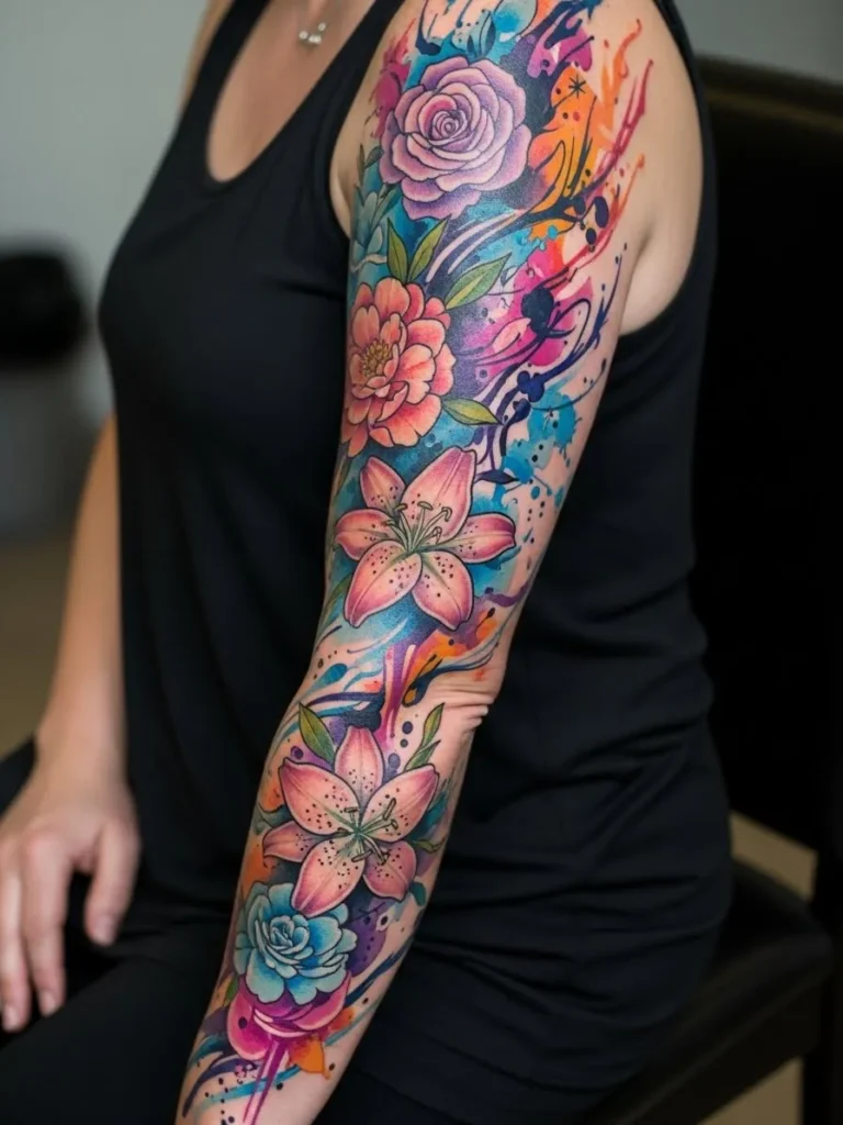 This watercolor sleeve combines roses, lilies, and layered florals painted in vibrant pinks, blues, and warm coral tones. The flowers are connected by flowing paint strokes and splatter details that create movement from shoulder to wrist. It is a bold full sleeve packed with color and texture.