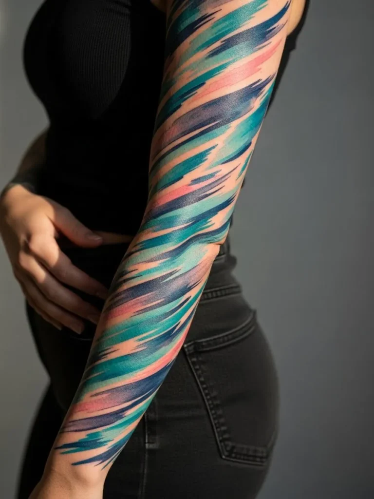 This abstract watercolor sleeve wraps the arm in layered brushstrokes of teal, blue, coral, and soft peach tones. There are no defined objects, just flowing color that follows the shape of the arm from shoulder to wrist. The effect feels modern, bold, and artistic.