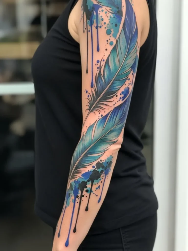 This watercolor sleeve features a large feather stretching along the arm, rendered in shades of blue and teal. Soft ink drips and splatter details add texture while keeping the feather light and airy. The placement elongates the arm and creates a calm, flowing look.