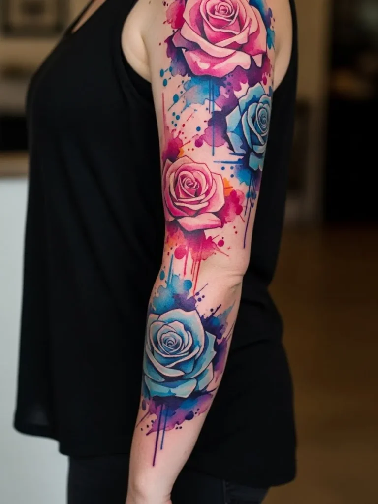 This watercolor sleeve features large roses flowing from the upper arm down toward the forearm, painted in shades of pink, purple, and soft blue. Loose splashes, ink drips, and layered watercolor textures surround each rose, giving the sleeve a painterly and expressive feel. The placement follows the arm naturally, making this a full sleeve that feels cohesive and bold without heavy outlines.