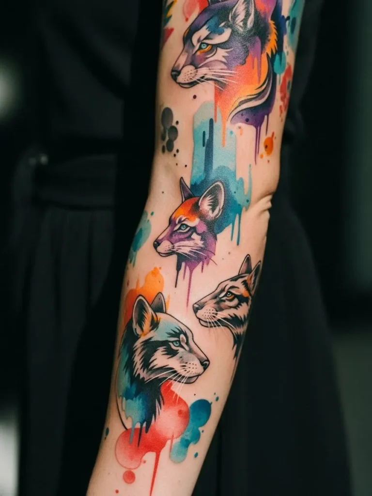 This watercolor sleeve showcases multiple wolf portraits spaced along the arm, each painted with soft realism and surrounded by colorful splashes of teal, orange, and red. The faces are detailed yet gentle, while dripping watercolor accents add movement and depth. It is a full sleeve that balances structure with artistic freedom.