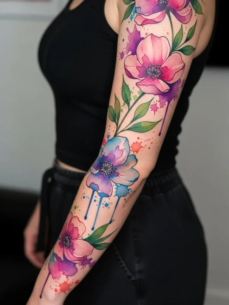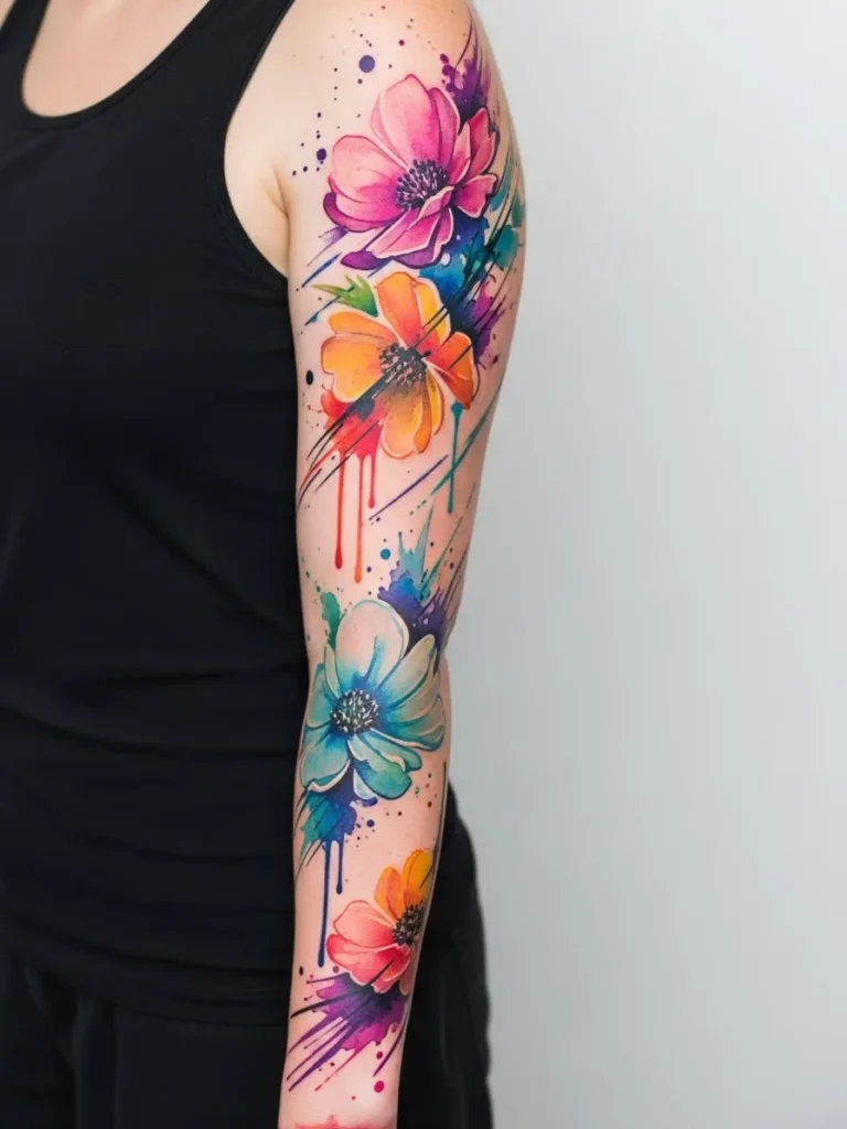 This watercolor sleeve showcases bold flowers in pink, orange, teal, and purple stretching from shoulder to wrist. Loose brush strokes, splatter details, and soft paint drips give the flowers a playful painted look. The colors pop beautifully against the skin, making this a full sleeve that feels artistic and expressive.