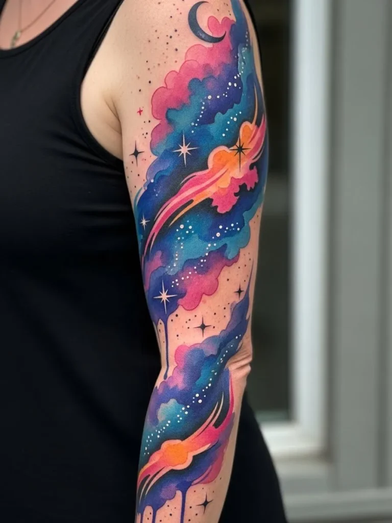 This watercolor sleeve wraps the arm in swirling clouds of blue, pink, and deep purple, accented with stars, dots, and a crescent moon. The colors blend smoothly with soft fades and curved shapes that follow the arm’s movement. It is a full sleeve that feels dreamy and expansive.